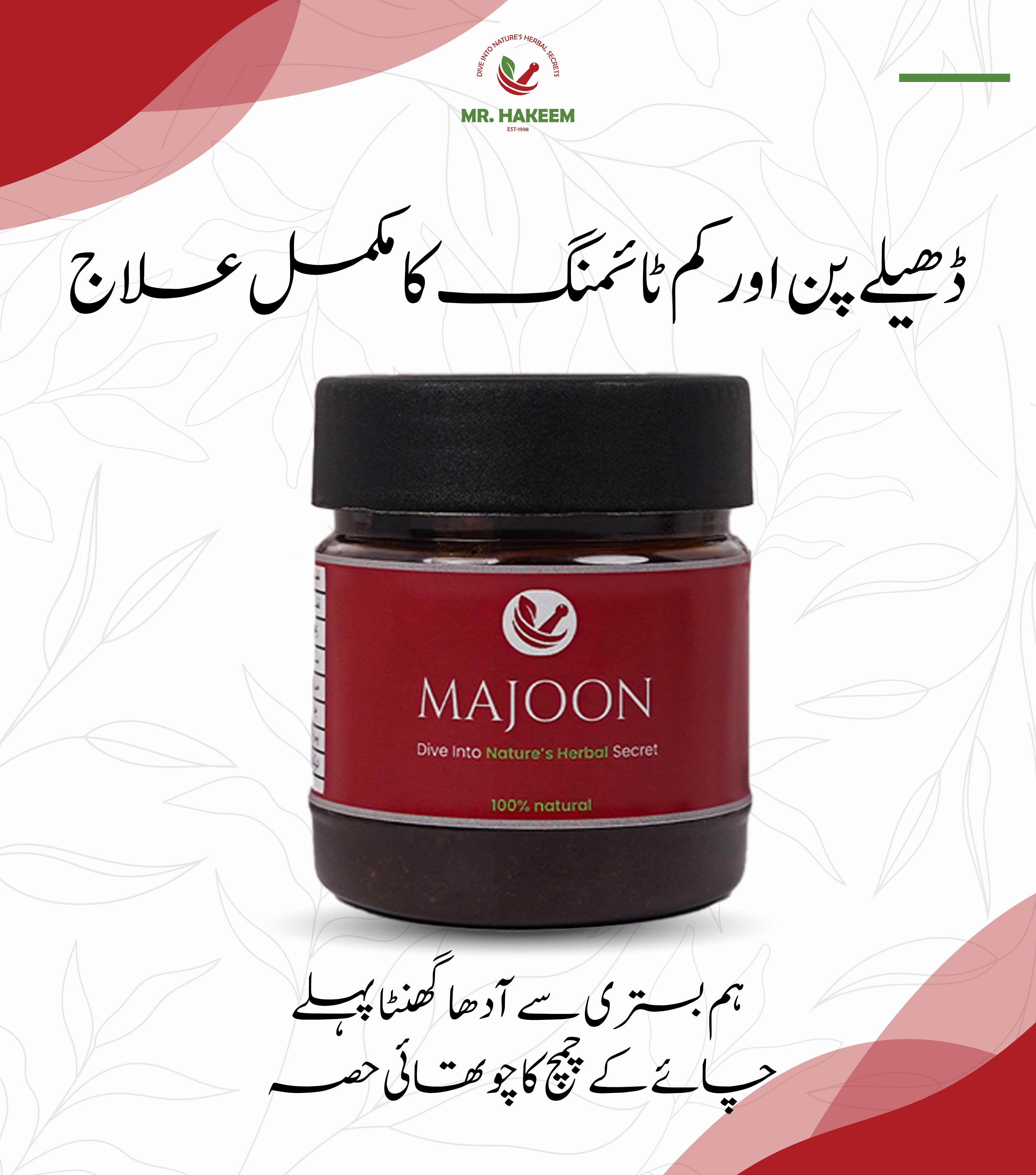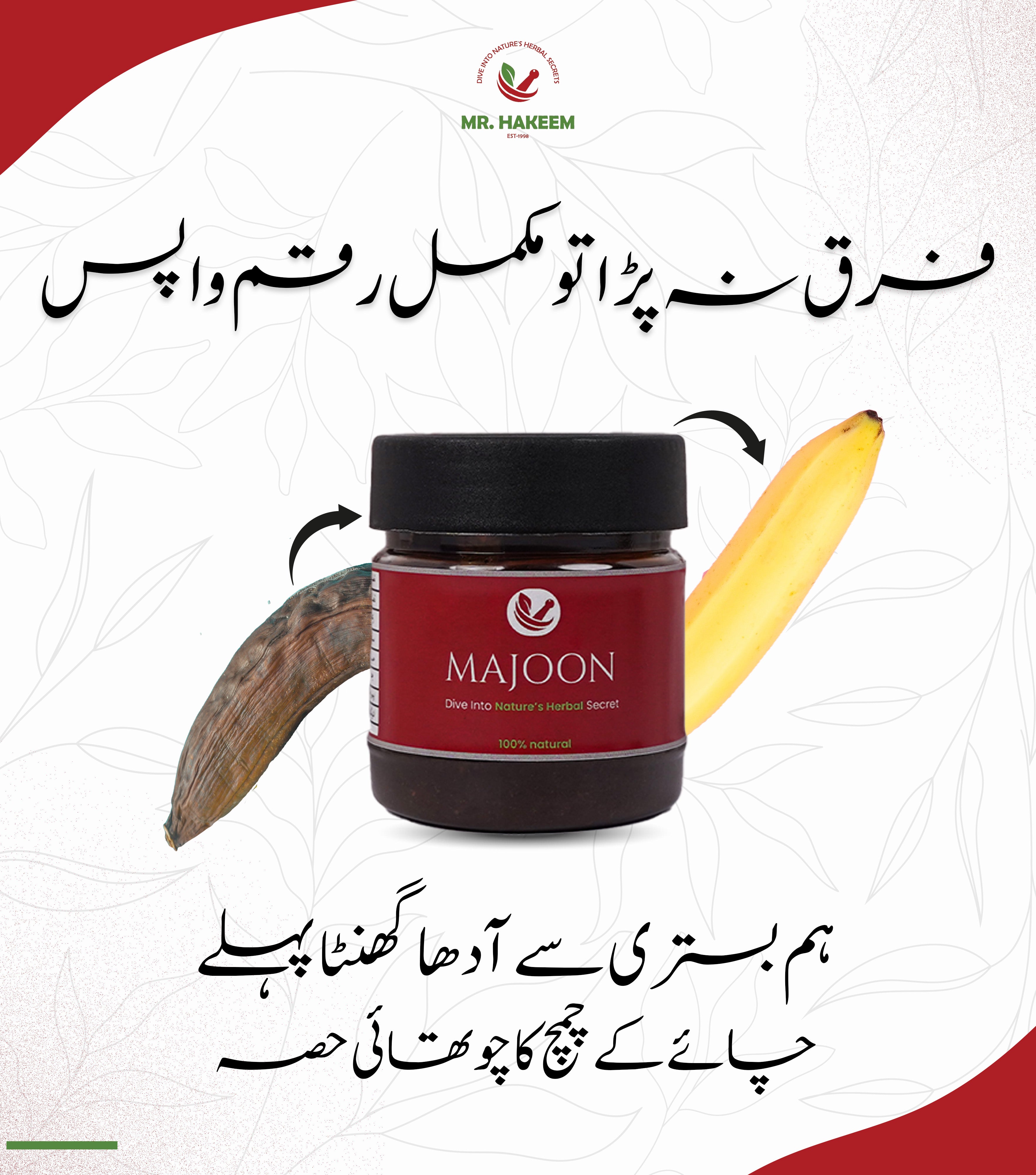 Introducing Hakeemʼs Majoon- Made from 100% herbal ingredients- Main Ingredients: Ashwagandha, Jadwar, Hab al Salateen, Behman Safaid, Singhara, Habb al Zalm, Salab Misri, Saffron, Salab Panja and 42 more.- Effectively Eliminates Erectile Dysfunction and Premature Ejaculation - Approved by PCSIR